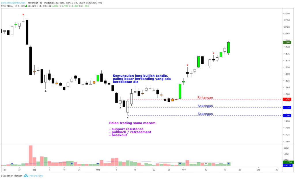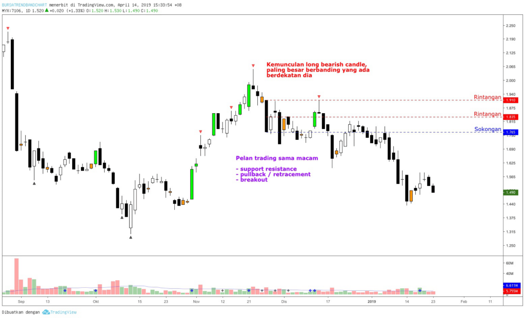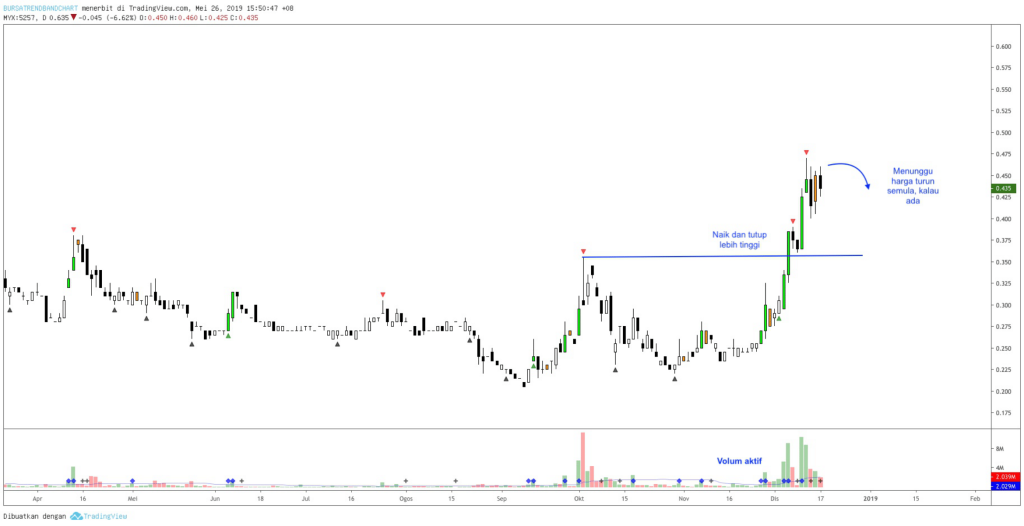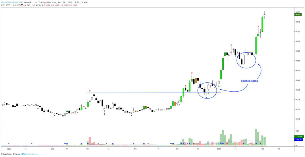 Sebelum breakout pun perhatikan juga yang volume tidaklah terlalu besar dan bentuk candle juga lebih kecil molek.