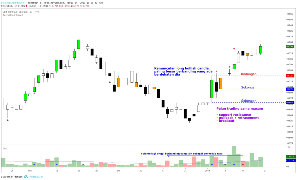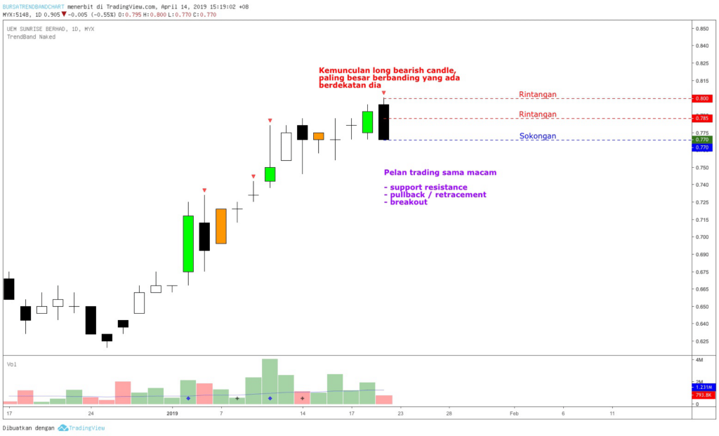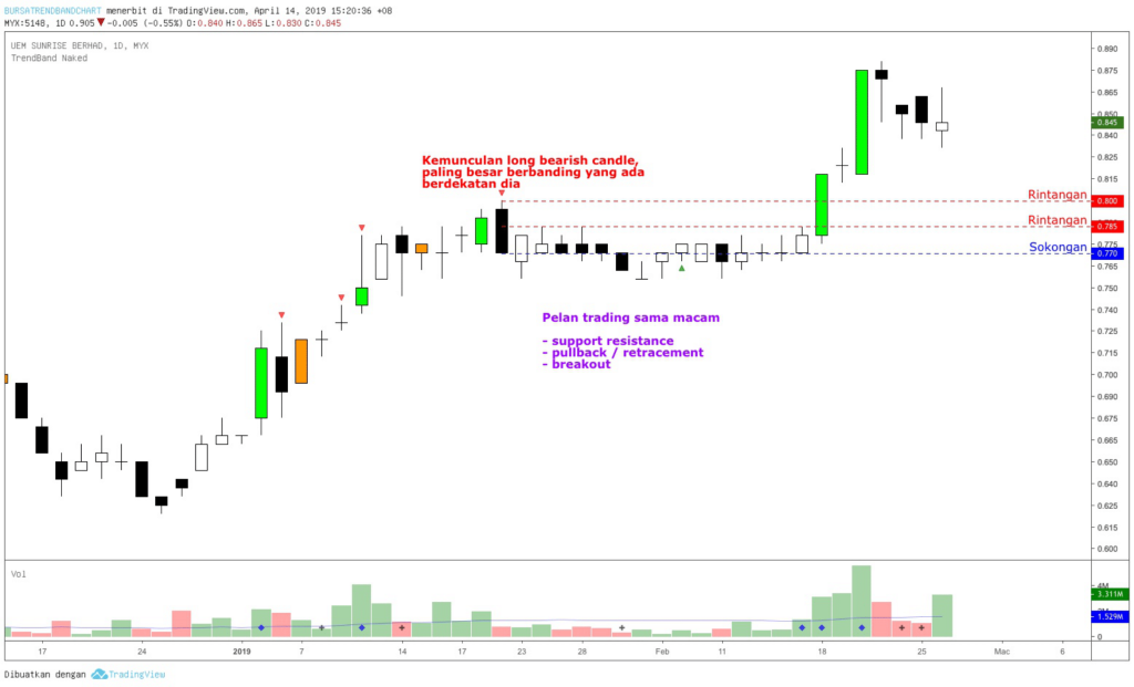 - Entry atau exit mestilah esoknya atau next candle. Kalau esoknya tak break resistance/support, tak payah buat ape-apa. Move on.